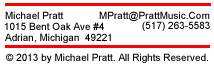Dr. Michael Pratt has degrees in music education and music composition from The University of Toledo, The University of Michigan, and Boston University. He studied composition with Pulitzer Prize winning composers Ross Lee Finney and Leslie Bassett at The University of Michigan. Having taught music in the public schools for many years in Michigan, he currently teaches music at Jackson College and Siena Heights University in Adrian, Michigan.